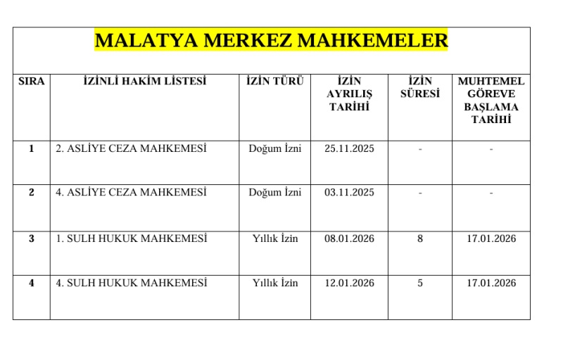 Malatya Adliyesi İzinli Hakim Listesi